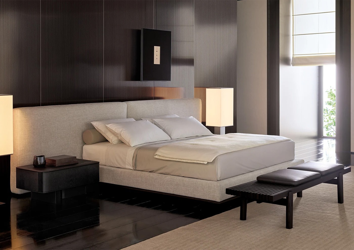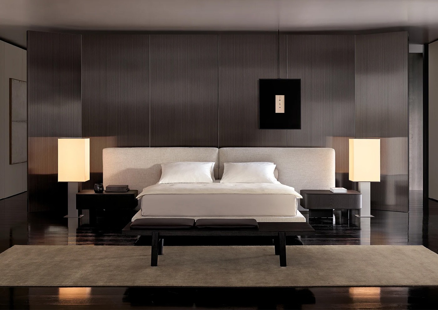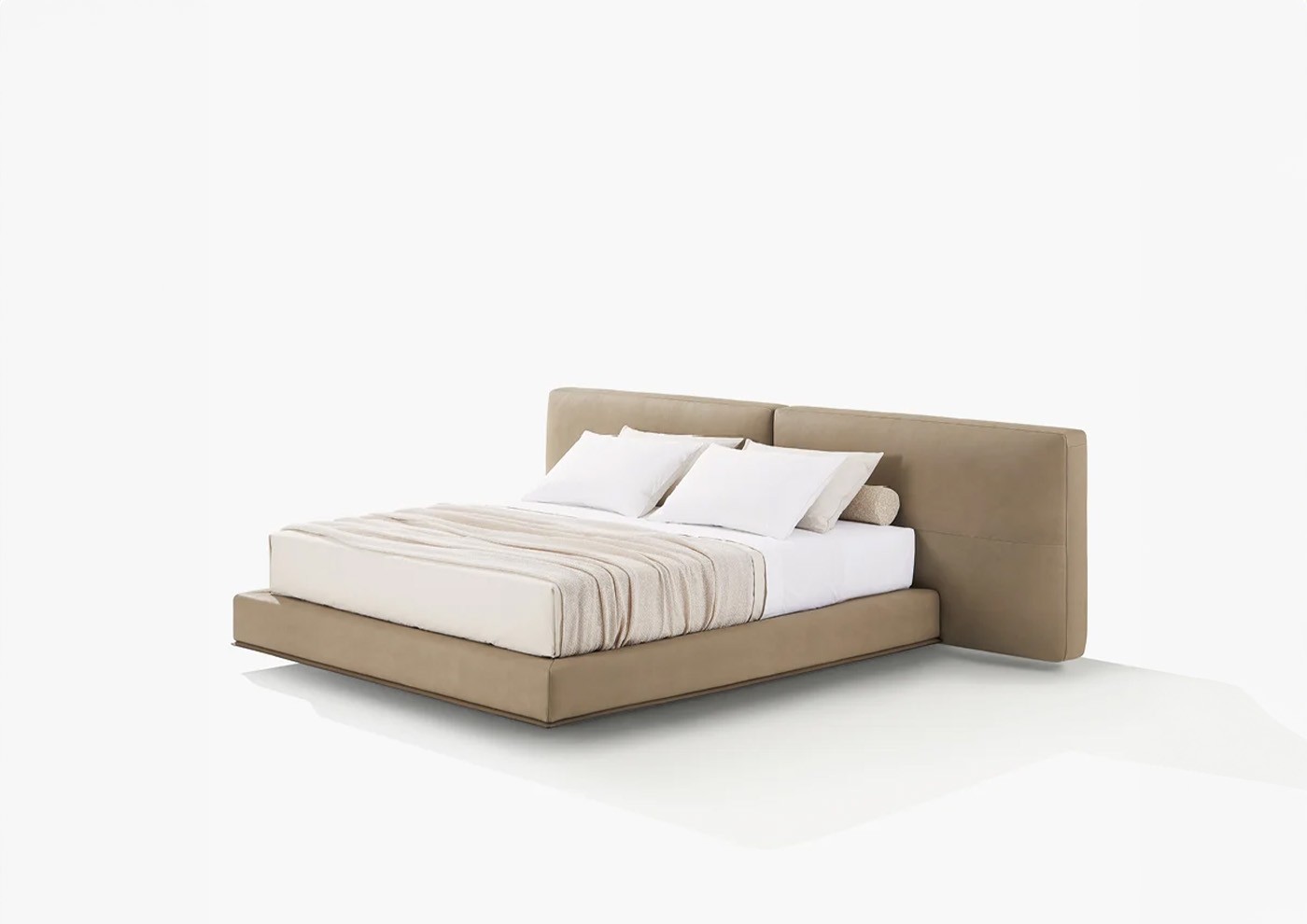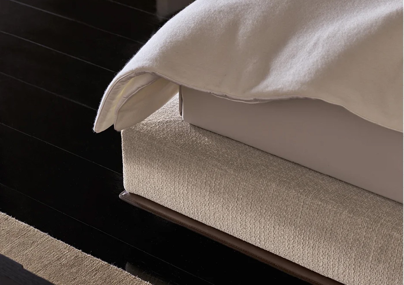 In the Brera collection, elegance is expressed through a clean, contemporary, and horizontal design. This also applies to the bed, with which Jean-Marie Massaud brings the idea of a domestic landscape with strong architectural connotations to the bedroom. The leather base recalls the couture details of the sofa, as do the feet and the large headboard.