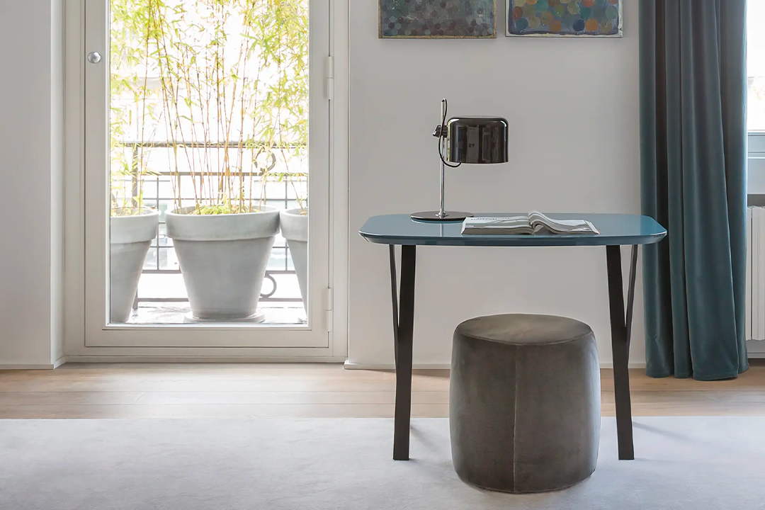 Bureau de petites dimensions, idéal pour les petits espaces et caractérisé par une admirable simplicité formelle. Aussi simple dans la version monochrome qu'unique et précieux avec la combinaison de différentes finitions.