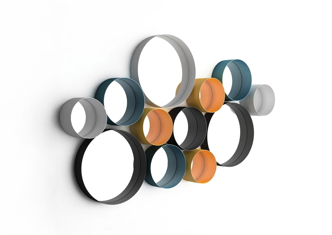 Specchi circolari a parete in metallo. Finitura goffrata e staffa per installazione a parete inclusa.